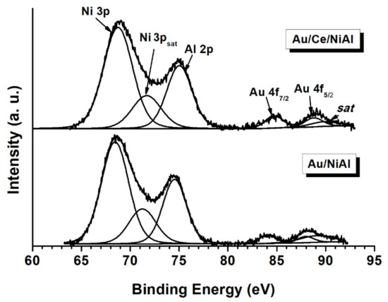In Figure 11, the spectral regions of the fitted Ni 3p, Al 2p and Au 4f are displayed. The binding energy of Al 2p was equal to 74.5 eV ± 0.1 eV, which is typical of aluminum oxide. The binding energy of Au 4f7/2 of 84.0 eV obtained in both gold-containing samples was typical of metallic gold [22]. The extra peak overlapping with the Au 4f5/2 component was due to an Al 2p plasmon satellite. The fitting allowed a proper quantification of the elements in terms of atomic ratios. The results for all the fresh catalysts in terms of binding energies and atomic ratios are summarized in Table 4.
