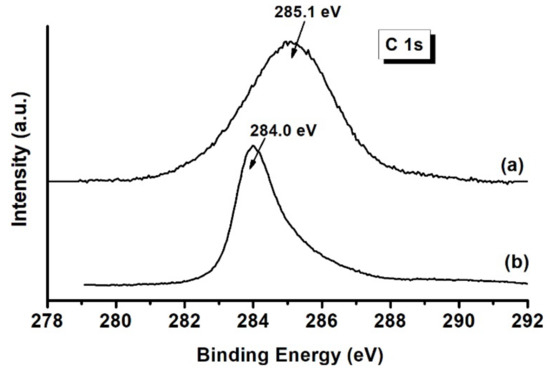 From the comparison of the XPS-derived surface atomic ratios Ni/Al XPS and Au/Al XPS with the corresponding bulk ratios, a surface depletion of nickel and gold was evident. This observation could have been a direct consequence of the migration of both metals inside the hydrotalcite structure during the precursor’s preparation procedure and during the calcination. It is worth noting the surface enhancement of nickel in the ceria- and gold-promoted catalysts, which explains their better initial activity with respect to the unpromoted one. Moreover, an enrichment of the surface gold concentration due to the presence of ceria was observed in the Au/Ce/NiAl catalyst. As shown in Figure 12 for the Au/Ce/NiAl sample, in accordance with the XRD patterns and the TGA analyses, a strong and asymmetric C 1s peak at ~284 eV typical of graphitic carbon was observed in all the C 1s regions of the spent catalysts [44]. Unfortunately, after the catalytic test, the extensive deposition of carbon over the samples prevented the XP analyses of the Au 4f peaks.