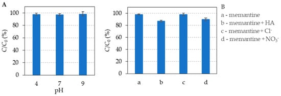 Photolytic degradation was investigated with memantine solution in MilliQ water (direct photolysis) and in the presence of substances commonly present in environmental waters: humic acids (HA), chloride and nitrate (indirect photolysis). The concentrations of inorganic ions and humic acids were typical for the environment. The presence of HA and nitrates resulted in a lower concentration of memantine, while chlorides did not affect photolytic degradation of memantine. The photolysis due to the presence of HA and nitrate can be attributed to the formation of highly reactive hydroxyl radicals [20,21]. However, the observed decrease in the concentration of memantine was not significant (less than 15% after 24-h exposure to simulated solar radiation, Figure 1B), which points to the conclusion of its persistence during exposure to artificial solar radiation. Blum et al. [22] reported similar results of memantine photolytic persistence with a degree of degradation of less than 10%.