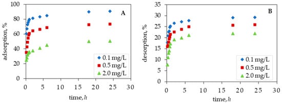 From Figure 2A, it can be seen that the “faster” sorption of memantine to the sediment sample occurs in the first 6 h, after which further sorption of memantine occurs slowly over the observed 24-h period. At the same time, desorption of the previously sorbed memantine takes place during the same time intervals (Figure 2B). It should be noted that, as the concentration of memantine increases, the amount of memantine sorbed and desorbed decreases, so that the largest difference between the amount sorbed and desorbed was obtained at the lowest initial concentration of memantine tested (0.1 mg/L). To investigate the control mechanisms of the sorption [32] and desorption processes, experiments were performed at different time periods, i.e., a kinetic study was performed at three concentration levels (0.1, 0.5 and 2.0 mg/L), in contrast to the other six concentrations at which the sorption experiments will be carried out.