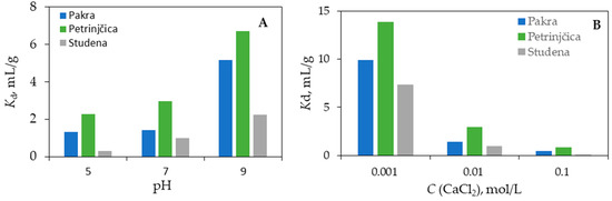 In addition to the influence of pH, the influence of ionic strength on the sorption of memantine was also investigated. It was found that the sorption coefficients decreased with increasing ionic strength (Figure 3B). The obtained results indicate a possible surface complexity between the memantine and the studied sediments. For all sediments studied, the highest Kd coefficient values were obtained at the lowest concentration of CaCl2 solution tested. The influence of ionic strength on sorption could be related to the fact that the thickness of the charged surface of the “electric double layer” is reduced, resulting in decrease in surface charge and fewer interactions between the ionic form of the drug and the sediment surface [40]. Of course, this theory is also supported by the fact that memantine is in the form of a neutral molecule [30] in all experiments performed, which makes a possible interaction even less likely. A similar trend was observed in a previous study of the sorption of memantine and in other studies of the sorption of pharmaceuticals [30,41,42,43].