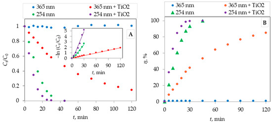 (A) Photolytic and photocatalytic degradation of memantine under UV-A (365 nm) and UV-C (254/185 nm) radiation by sol-gel nanostructured TiO2 film as a function of irradiation time, C0 (memantine) = 10 mg/L. Inset: linear transform of −ln (Ct/C0) versus t. (B) Photolytic and photocatalytic degradation efficiency. All experiments were triplicated with the standard deviation from the average value ± 4%.