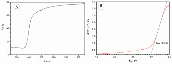 Energy bandgap (Eg) of prepared TiO2 was calculated from diffuse reflectance spec-troscopy (DRS) measurements, which were performed on a QE Pro High-Performance Spectrometer (Ocean Insight, Orlando, FL, USA) equipped with an integrating sphere and a DH 2000 deuterium–halogen source in the analysis range 200–1000 nm with a resolu-tion of 1 nm and integration time of 10 s.