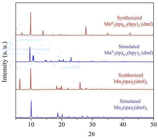 To confirm the phase structure and purity of the prepared photocatalysts, PXRD spectra for the two MOFs (MnII3(tp)6/2(bpy)2.(dmf) and Mn2(tpa)2(dmf)2) were obtained (Figure 2). Comparing the PXRD pattern of the prepared MOFs with the simulated pattern obtained from SC-XRD matched the previously reported pattern [54,55]. In the case of MnII3(tp)6/2(bpy)2.(dmf), some peaks were missing, which might have been a result of the preferred orientation that is typical for 2D MOFs (Figure 2) [56,57,58]. According to Figure 2, the peaks for synthesized Mn2(tpa)2(dmf)2 are in good agreement with the previous study [55], which proved that prepared Mn2(tpa)2(dmf)2 was successfully and purely synthesized. The synthesized Mn2(tpa)2(dmf)2 and MnII3(tp)6/2(bpy)2.(dmf) exhibited good crystallinity, as shown by the sharp intensities of the diffraction peaks.