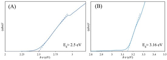 The band gaps of both MOFs were determined using the relationship between the wavelength and reflected light intensity from DRS using the Tauc plot method and Equation (1).