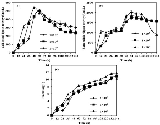 Effects of inoculum levels on production of cell-bound lipase (a), extracellular lipase (b), and biomass (c) of M. spicifer SPB2 cultivated in IMY medium containing 2% soybean oil and 0.2% Gum Arabic at 30 ± 2 °C under a shaking speed of 200 rpm.