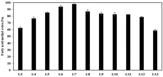 Effects of the ratio of the molar ratio on FAME production in the transesterification reaction using a 2 mL microcentrifuge tube catalyzed by M. spicifer SPB2 cells from a 5-L stirred-tank bioreactor. This was in the presence of palm oil and methanol, as substrates with 5 × 109 of yeast cells per gram substrate, incubated at 30 ± 2 °C in a vigorous shaker for 72 h.