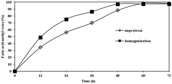 The up-scaled transesterification reaction was carried out in a 20 mL vial. Palm oil was homogenized at a speed of 8000 rpm for 20 min before being used as a substrate in the transesterification reaction. Homogenization is a mechanical process to reduce the molecular size and viscosity of palm oil [43]. FAME production was facilitated by this palm oil pretreatment (Figure 9). At 24 h of the reaction, FAME yield of 75.17% was achieved, which was 1.34-fold higher than the yield of 56.20% generated using non-homogenized palm oil as a substrate. At 48 h, FAME yield of 97.01% was observed with homogenized substrate, while that using an unpretreated one yielded <85% and then slowly culminated to 98.2% at 60 h. The result indicated that the pretreatment of palm oil with homogenization increased the production of FAME in the early stages of the transesterification reaction when whole-cell lipase from M. spicifer SPB2 was used as the biocatalyst.