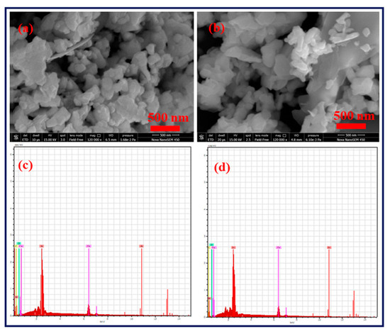 The field effect scanning electron microscopy (FESEM) technique was used to examine the surface morphology of [BiFe1−xLixO3]-graphene nanocomposite, and their outcome is shown in Figure 2. The FESEM results revealed that BiFe1−xLixO3 particles had a spherical-like morphology (Figure 2a,b), and their sizes were between 50 nm and −130 nm in diameter. With increasing the Li content in [BiFe1−xLixO3]-graphene nanocomposite from 4 to 6%, the size of BiFeO3 nanoparticles was almost similar. However, nanoparticles were agglomerated onto graphene nanosheets with increased Li content, as shown in Figure 2a,b. The BiFe1−xLixO3 nanoparticles displayed relatively substantial agglomeration, which might remain stated to its weak ferromagnetic result. However, the existence of graphene nanosheets over the synthesis progression led to a slight dropping the particle size of the BiFe1−xLixO3 particles, representing well-grown BiFe1−xLixO3 nanoparticles onto the graphene nanosheet. Additionally, the reduction in BiFe1−xLixO3 nanoparticles onto graphene nanosheets was explained by the restricted Bi3+ and Fe3+ ionic motion due to the existence of graphene nanosheets.
