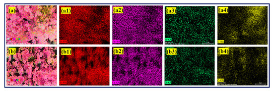 The energy dispersive X-ray spectroscopy image of [BiFe1−xLixO3]-graphene nanocomposite. (a–a4) x = 0.04 and (b–b4) x = 0.06.