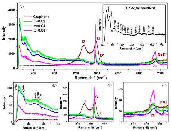 The Raman spectra of the 5–10-layer graphene sample are shown in Figure 4, along with the observed peaks mentioned as D, G, D’, 2D, and (D + D′). The vibrational mode D-band nearby 1352 cm−1 and its associated bands 2D and (D + D′) were due to Raman-active defects since the perfect structure of graphite [22]. The vibrational mode G-band nearby 1580 cm−1 represents the graphitic G-band. Raman spectra of [BiFe1−xLixO3]-graphene nanocomposite are displayed in Figure 4a, where the peaks are consistent with BiFeO3 being located in the range of 100–650 cm−1. In addition to the BiFeO3 modes, the D and G modes in the range 1000–1600 cm−1 proved the existence of graphene in the 10% graphene integrated BiFe1−xLixO3 nanoparticles. The observed intensity variation and shift in the D and G bands of [BiFe1−xLixO3]-graphene nanocomposite with increasing Li content suggested that the BiFe1−xLixO3 interfered with the sp2-domains of graphene through the composite synthesis. Such interference can be attributed to defects in graphite nanoflakes. The intensity ratio of Raman D and G bands (ID/IG) was extensively exploited to estimate the excellence of graphene in hybrid materials [22]. Accordingly, the ID/IG ratios were 0.45 for x = 0.06, 0.50 for x = 0.04, 0.51 for x = 0.02, and 0.80 for pure graphene. Therefore, the decreased value of ID/IG for [BiFe1−xLixO3]-graphene nanocomposite with increasing Li content showed a substantial interfacial contact reduction between the BiFe1−xLixO3 and graphene.