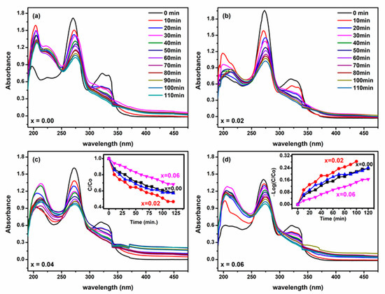 The photocatalytic activity of the [BiFe1−xLixO3]-graphene nanocomposite for the diminishment of CIP under the UV-visible light irradiation below 10 °C temperature conditions was studied and is represented in Figure 7. The CIP degradation was performed in the presence of a 150-watt mercury lamp in a specifically designed photoreactor system that prevented outer heat and light. Figure 7 represents the variations of the absorbance spectra for CIP antibiotics under UV-visible light irradiation using [BiFe1−xLixO3]-graphene nanocomposite photocatalysts. The CIP degradation ability of the catalyst was inconsistent with the change in the value of x from 00.00 to 0.06 in prepared samples. The photocatalytic efficiency was 42% for x = 0.00, 53% for x = 0.02, 42% for x = 0.04, and 31% for x = 0.06 within 110 illuminations. In contrast, the pristine BiFeO3 nanoparticles showed only 21%. The maximum degradation observed for x = 0.02 was obtained, i.e., 53% of the CIP was degraded within only 110 min irradiation time. The photocatalytic performance was more than double that of pure BiFeO3 nanoparticles. The graphene greatly modulated the bandgap of BiFeO3, as discussed in the optical properties, and the covalent bonding between BiFeO3 and graphene was responsible for the enhanced photocatalytic properties. The band gap of the BiFeO3 nanoparticles can be modulated with the graphene oxide and reduced graphene oxide reported by Kadi et al. [17]. The catalytic activity of BiFe1-xLixO3-Graphene nanocomposite sample (x = 0.02) against CIP has been also studied as shown in supplementary materials Figure S1. No significant degradation is observed without light for x = 0.02 sample.