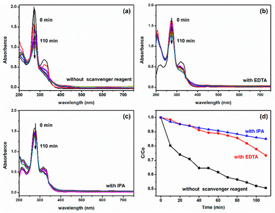 The photocatalytic activity of [BiFe1−xLixO3]-graphene nanocomposite (x = 0.02) for the degradation of CIP with or without trapping agents was completed under a 110 min exposure to UV-visible light. Figure 8 shows the photo-activity of x = 0.02 photocatalysts under UV light in the presence of trapping agents EDTA as h+ scavenger and IPA as OH− scavenger during the subsequent 110 min duration (10 min intervals). The CIP concentration was reduced by adding [BiFe1−xLixO3]-graphene nanocomposite (x = 0.02) photocatalysts with EDTA or IPA, but the rate of degradation was not the same as without trapping results. Both scavenger agents captured the active species during the photocatalytic reaction and, due to this, the antibiotic degradation process decreased. In absorption curves, it was demonstrated that the addition of IPA with photocatalysts, the degradation activity was highly reduced, which revealed the role of .OH radicals. However, the .OH radicals were not only responsible for CIP degradation. The addition of EDTA with catalysts also showed the reduction in photodegradation of CIP, which shows the participation of h+ during the photocatalytic activity. During the trapping experiment, it was observed that saturation condition also occurred after some time intervals, which verified the role of O2− radicals in CIP degradation.