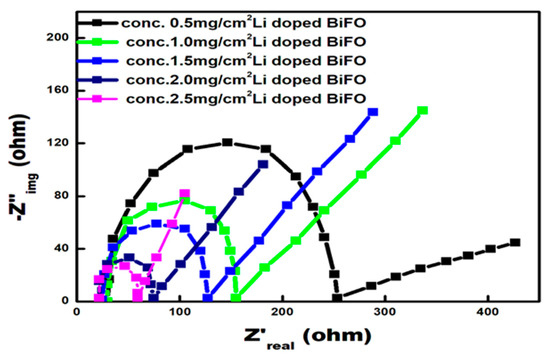Nyquist plot of the MFC with different concentration of [BiFe1−xLixO3]-loaded graphene composite cathode concentrations.