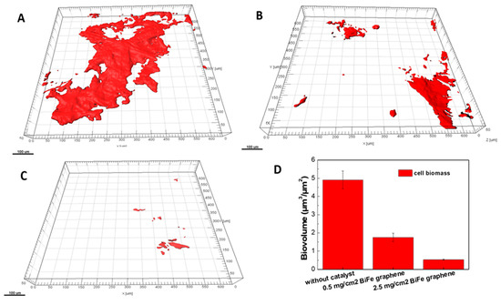IMARIS 3-D images of biofilms on different concentrations of [BiFe1−xLixO3]–graphene composite cathode. Biomass cell can be seen as red clumps. (A). cathode surface without catalyst; (B). 0.5 mg/cm2 cathode catalyst; (B,C) 0.5 mg/cm2 cathode catalyst. (D) the biovolume of microbial fouling on different catalyst loading cathode surface. Every image is a perspective that measures several 600 µm by 600 µm.