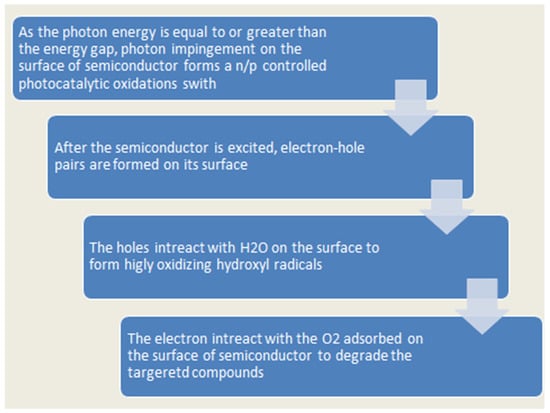 In primary photocatalysts, the catalytic components are linked to single metal oxides, carbonaceous materials, or two-dimensional advanced materials [15]. The photocatalytic mechanism is illustrated in Figure 1. Many carbon-based carriers and semiconductor materials have enhanced the quality of photocatalytic degradation through their active surface area, improving the absorption of visible light, forming effective p- and n-type semiconductor nanojunctions, and suppressing interfacial charge recombination [16,17].