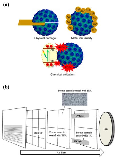(a) The structure and chemical properties, the efficiency of inactivating viruses, and the mechanism of inactivating viruses [79] (b) The schematic view of the structure of the air cleaner and the porous ceramic substrate [80].