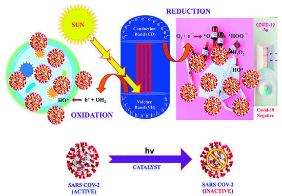 Recent research has demonstrated the enormous potential of photocatalytic material surfaces for the inactivation of SARS-CoV-2 [8]. Several different photocatalyst nanomaterials have been used as antibacterial or antiviral materials for photo-induced bacterial and viral infections and self-cleaning properties [9]. In addition, a photocatalytic system using semiconductors made of graphene oxide (GO) to cure cancer has been identified. GO can be employed as an antibacterial and anticancer agent owing to its excellent properties. Porcine herpes virus was used to investigate GO’s antiviral activity, and the results showed that GO inhibited viral infection in noncytotoxic samples [10,11]. The development of reusable TiO2 nanowire-based air filters as photoactive materials have been described for the first time [12]. The filters were significantly more efficient to a greater extent because of their large surface area, polycrystalline counterparts, and super-hydrophilicity. Thus, it is a promising photocatalyst owing to the chemical species that are adsorbed on its surface’s highly potent ability to oxidize when exposed to light [13]. Photocatalytic activities are generally influenced by structural and surface modifications, including specific surface area, particle shape, size, and adsorption nature [14]. Therefore, this review discusses the most recent photocatalytic systems, including metals, metal oxides, carbonaceous nanomaterials, and 2-dimensional advanced structures, for efficient SARS-CoV-2 inactivation.