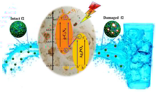 - Cheng, R.; Shen, L.-J.; Yu, J.-H.; Xiang, S.-Y.; Zheng, X. Photocatalytic Inactivation of Bacteriophage f2 with Ag3PO4/g-C3N4 Composite under Visible Light Irradiation: Performance and Mechanism. Catalysts 2018, 8, 406. [Google Scholar] [CrossRef]