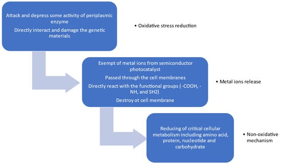 The process that produces ROS production is crucial for viral destruction. The cytoplasmic membranes strike the components present in the intercellular, including genetic contents inside the microorganism, which are the next steps in the major breakdown of microorganisms after a protracted ROS attack damages the cell wall (Figure 6). Viruses and bacteria that serve as hosts frequently coexist in natural water. Hence, the effectiveness of the inactivation of photocatalytic in a virus/bacterium is crucial from a practical standpoint. Natural organic molecules affect photocatalytic virus disinfection in water systems. The water systems contain natural organic materials (NOMs) such as nucleic acids, carbohydrates, and proteins, in addition to bacteria [77,89]. They may also act as disinfectants and quench ROS production. Therefore, NOMs must be considered when disinfecting viruses.