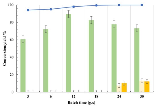 As ‘batch time’, defined as the product of catalyst mass and reaction time, is one of the major factors determining the extent of a chemical reaction [], it was screened next. Fructose conversion and product yield as a function of batch time is given in Figure 1. Increasing batch time from 3 to 36 g·s significantly improves 5-HMF yield from 60% to 89%, respectively. However, further increasing batch time resulted in a decrease in 5-HMF yield, while the yield of LA and FA further increased. Furthermore, an unavoidable phenomenon was observed at longer reaction times; the mixture gradually changed from an orange to a dark brown dense liquid due to humin formation []. This finding was most pronounced at CH conditions and is attributed to an unfavorable caramelization reaction during sugar heating in the presence of the acid catalyst, which is a combination of aldose–ketose isomerization, dehydration, and anomeric–cyclic equilibrium [].