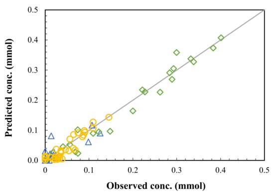 Parity diagram for all experimental and simulated points of fructose dehydration carried out under CH and MW conditions. (Δ) stands for fructose conversion, (ο) denotes LA + FA, and (□) denotes 5-HMF.