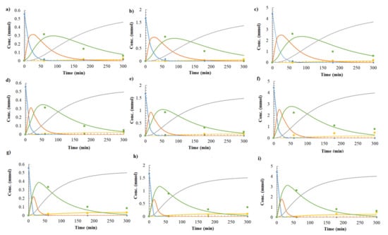 Kinetic model fit (lines) to the individually obtained experimental data. Typical time–concentration profile of the products of acid-catalyzed fructose dehydration at (a–c) 140 °C, (d–f) 150 °C, and (g–i) 160 °C for 100, 300, and 800 mg using CH heating with 3 mL solvent, 10 mg MIL-101(Cr)-SO3H(3), and 100 mg fructose (0.56 mmol). Symbols denote experimental values: (■, ▬) fructose conversion, (▬) intermediate formation, (■, ▬) 5-HMF production, (■, ▬) LA + FA production, (▬) side product formation.