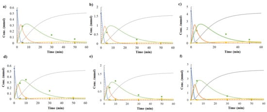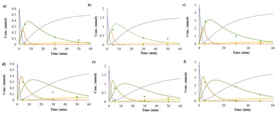 Figure 3 shows the model simulations for CH at 140, 150, and 160 °C, as well as the experimentally obtained results at these temperatures. It can be observed that fructose dehydration to 5-HMF starts in the early minutes of heating. The maximum concentrations of the intermediate and 5-HMF are consecutively established, followed by degradation due to 5-HMF hydration to LA and FA and humin formation. Other side reactions may also occur with longer reaction times but are not considered specifically, i.e., their potential contribution is embedded in the considered humin formation [,,]. At 140 °C and 150 °C (Figure 3a–f), 5-HMF yield reached its maximum values at 85 and 60 min, respectively. Overall, model simulations compared to experimental data for representative kinetic experiments of all experimental data indicate that the model describes experimental trends in CH reactors at various conditions (see Figure 3).