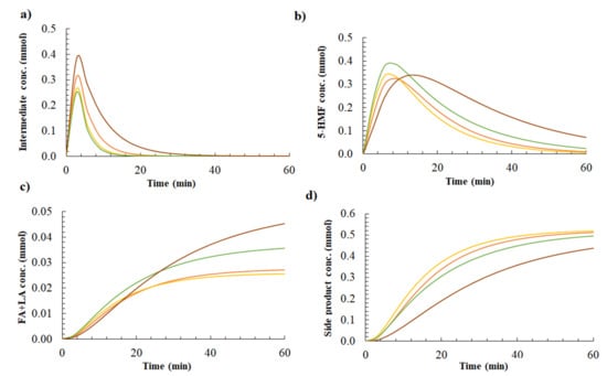 Performance profiles under MW conditions were simulated using the rate coefficients at 140, 150, and 160 °C, respectively (see Figure 4 and Figure 5). As a result, it can be observed that the trends of 5-HMF, LA, and FA are qualitatively similar to those from the conversion of fructose under CH conditions, with the notable quantitative difference that the reaction occurred in a much shorter time under MW conditions, i.e., the rate of 5-HMF formation was faster under MW conditions. Nevertheless, many researchers still doubt whether reactions under MW conditions would occur according to the exact mechanisms that are exhibited under CH conditions [,].