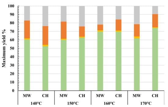 For CH, an increase in temperature leads to a rise in the maximum 5-HMF yield from fructose though this was obtained over a longer reaction time than under MW conditions (Figure 7), indicating the higher activation energy for fructose dehydration under CH conditions. For example, 5-HMF yield increased from 54.3 to 70.1% under CH conditions by increasing the reaction temperature from 140 °C to 160 °C. The results showed that, at 170 °C, the highest yield of 5-HMF was achieved using CH (74.2%).