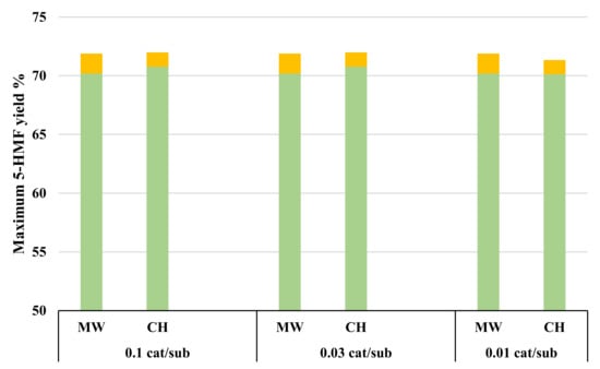To evaluate the potential for industrial-scale applications, it is important to consider the amount of fructose that can be processed. Therefore, simulations were conducted for different substrate quantities ranging from 100 to 800 mg of fructose in a DMSO/acetone (70/30) solvent mixture, which corresponded to catalyst-to-substrate ratios of 0.1, 0.03, and 0.01. It was observed that fructose conversion occurred rapidly under microwave conditions regardless of the fructose-to-catalyst ratio, which is consistent with previous findings []. Figure 8 illustrates the highest achievable dehydration yield under MW and CH conditions. As hinted before, a similar maximum 5-HMF yield in both reactors was obtained at different reaction times.