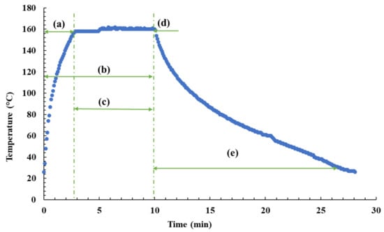 Temperature profile of a microwave irradiation experiment using the standard power mode: (a) ramp time or heating time (heating from an ambient temperature to the final reaction temperature over the first 0–1 min), (b) total time, (c) reaction time, (d) end of hold reaction time at the desired reaction temperature, and (e) heat dissipation time without power supply.