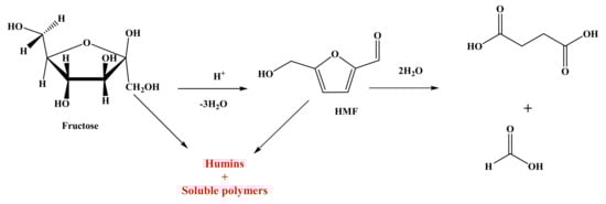 Dimethyl sulfoxide (DMSO) (C2H6OS ≥ 99.9%, Sigma Aldrich, Saint Louis, MO, USA), acetone (C3H6O ≥ 99.5%, Acros Organics, Madrid, Spain), 5-hydroxymethylfurfural (5-HMF) (C6H8O3 ≥ 99.5%, Sigma Aldrich, Saint Louis, MO, USA), d-fructose (C6H12O6 ≥ 99% Sigma Aldrich, Saint Louis, MO, USA), levulinic acid (C5H8O3 ≥ 99.5%, Sigma Aldrich, Saint Louis, MO, USA), formic acid (CH2O2 ≥ 99.5%, Sigma Aldrich, Saint Louis, MO, USA), sulfuric acid (H2SO4 ≥ 98%, Sigma Aldrich, Saint Louis, MO, USA), hydrochloric acid (HCl ≥ 98%, Sigma Aldrich, Saint Louis, MO, USA), and HPLC water. Chemicals were used without further purification. Catalyst preparation has been described elsewhere [].