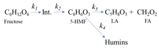 Villanueva et al. investigated the kinetics of fructose conversion using ZrPO-700 as a catalyst at 125–145 °C (Table S2, Entry 5) []. The model was constructed using a similar reaction network to the one proposed in this work involving the conversion of fructose to a common intermediate, which was subsequently converted to 5-HMF before 5-HMF hydration to LA and FA. In parallel, fructose individually reacts to humins. The obtained activation energy for fructose conversion to this intermediate amounted to 186 kJ/mol (Entry 5), while the value obtained in this work was 88 kJ/mol (Table S2, Entry 1), indicating a significant dependence on the catalyst.