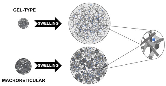 - Metal distribution within the resin beads depends on the resin type as follows: (a) homogeneous distributions are easily achieved in gel-type resins; (b) in contrast, when macroreticular resins are used, a clear heterogeneous distribution of the metal is observed, with the metal being concentrated at the macropores surface; and (c) as a strategy to circumvent this phenomenon, hyper-crosslinked resins can be used to obtain homogeneous metal distributions while maintaining a permanent, open mesopore structure of the polymeric backbone.