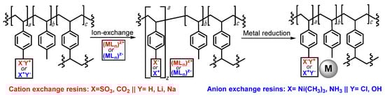 - Doping IERs with metal catalysts is a well-known technique that can be roughly summarized as a two-steps procedure consisting of (a) metalation step, that is, dispersion of a metal into the IER, typically conducted by contacting the functionalized IER with a solution of a metal salt, which acts as a precursor, to allow ion-exchange ((MLn)2+ cations for cationic resins and (MLn)2− anions for anionic resins are required); and (b) activation of the catalyst, that is, reduction of the metal in its ionic form to its zero-valence form, to produce catalytically active metal nanoparticles. Scheme 1 illustrates such a technique for cation and anion exchange resins with an ST-DVB polymeric matrix.