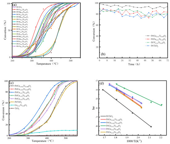 Catalytic activity and Ea values of Pt/CexTi1−xO2 (x = 0, 0.002, 0.005, 0.01, 0.02, and 0.05) catalysts.