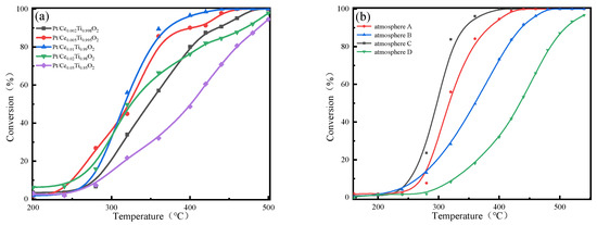 (a) Catalytic activity of Pt/CexTi1−xO2 catalysts. Reaction conditions: [C2H6] = 1000 ppm, [O2] = 4 vol%, [H2O] = 5%, [SO2] = 100 ppm, balance N2, total flow rate = 200 mL/min, and GHSV = 60,000 h−1. (b) Catalytic activity of Pt/Ce0.01Ti0.99O2 catalysts in different atmospheres. Atmosphere A: 1000 ppm ethane, 4% oxygen, N2 balance, 100 ppm SO2, and 5% water. Atmosphere B: 1000 ppm ethane, 4% oxygen, and N2 balance. Atmosphere C: 1000 ppm ethane, 4% oxygen, N2 balance, and 100 ppm SO2. Atmosphere D: 1000 ppm ethane, 4% oxygen, N2 balance, and 5% water.