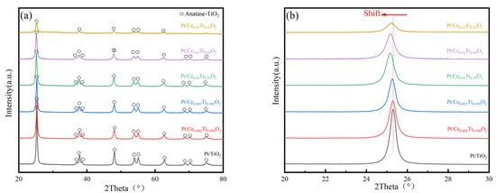 Note that with the increase in the Ce-doping amount, the peak position of the Pt/Ce0.01Ti0.99O2 catalyst showed the maximum offset. However, with a further increase in the doping amount, there was a slight variation in the main peak position of (101), since CeO2 may be generated in the process of peak intensity weakening but cannot be detected with XRD. In this case, no more Ce ions can exist in the lattice, and the largest number of oxygen vacancies in the Pt/Ce0.01Ti0.99O2 catalyst may be achieved. This phenomenon is further discussed in the following sections.