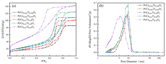 (a) Nitrogen adsorption–desorption isotherms and (b) pore size distribution curves of Pt/CexTi1−xO2 catalysts.