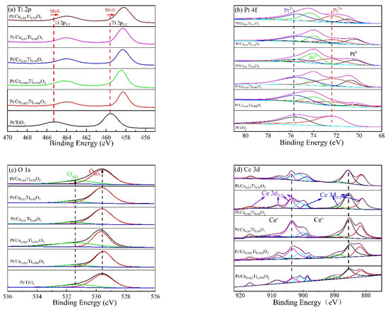 XPS spectra of Pt/CexTi1−xO2 catalysts: (a) Ti 2p, (b) Pt 4f, (c) O 1s, and (d) Ce 3d.