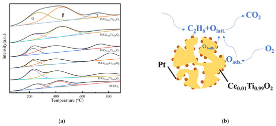 The performance of ethane oxidation is closely related to the oxygen storage capacity of the catalyst. The O2-TPD results of the Pt/CexTi1−xO2 (x = 0, 0.002, 0.005, 0.01, 0.02, and 0.05) catalysts are studied in this section and are shown in Figure 7a. All catalysts showed three desorption peaks near 230, 400, and 700 °C, which can be expressed as α, β, and γ, i.e., the desorption of surface-adsorbed oxygen species, the desorption of surface lattice oxygen, and the thermal decomposition of the catalyst, respectively. Since the Ce element has a good oxygen storage performance, it can be seen intuitively from the figure that as the doping amount of Ce increased, the O2 desorption peak area of the α and β peaks gradually increased, indicating that the oxygen storage capacity of the catalyst was enhanced. The quantitative data obtained from the peak fitting of the curve are shown in Table 2. It has been reported that α and β oxygen species can participate in catalytic oxidation through a surface mechanism and an MVK mechanism [32], respectively. The desorption temperature of the α peak and the β peak of Pt/Ce0.01Ti0.99O2 was lower than that of other catalysts, which directly reflects that the surface-adsorbed oxygen species and surface lattice oxygen species were more active than those of other catalysts. During the catalytic oxidation of ethane, oxygen absorbed on the surface and stored in Pt/Ce0.01Ti0.99O2 in the lattice state was first activated, which resulted in a better catalytic performance than that of other catalysts. However, lattice-state oxygen became predominant with the promotion of oxidation and participated in the whole process. Generally, the ratio between two desorption peak areas (Aβ/Aα) represents the relative amount of active lattice oxygen on the catalyst surface [33], and a more relative amount of active lattice oxygen facilitates the catalytic oxidation reaction. As shown in Table 2, after calculation, Aβ/Aα could be sorted as Pt/Ce0.01Ti0.99O2 (2.90) > Pt/Ce0.005Ti0.995O2 (2.40) > Pt/Ce0.02Ti0.98O2 (2.39) > Pt/Ce0.05Ti0.95O2 (1.55) > Pt/Ce0.002Ti0.998O2 (1.52). The obtained pattern is consistent with the T90 results of the catalyst evaluation (Table 1), proving that surface lattice oxygen is positively correlated with the deep catalytic oxidation of ethane. Consequently, among these catalysts, Pt/Ce0.01Ti0.99O2, with the largest Aβ/Aα and abundant active surface lattice oxygen, was proven to have the best catalytic oxidation performance.