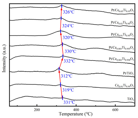 The H2-TPR results of the Pt/CexTi1−xO2 (x = 0, 0.002, 0.005, 0.01, 0.02, and 0.05) catalysts and the corresponding supports, Ce0.01Ti0.99O2 and TiO2, are studied in this section and are shown in Figure 8. There was a strong reduction peak between 310 and 330 °C for all samples. After doping with Ce, the reduction peak of the carrier TiO2 sample moved to a lower temperature and continued shifting to further lower regions with the loading of the Pt noble metal, which reflects the interaction between the active Pt component and the Ce- and TiO2-doped elements [36]. The reduction temperature of all Pt/CexTi1−xO2 reduction peaks was higher than that of Pt/TiO2. This can be explained by the formation of the Ce2Ti2O7 solid solution, which can form weak Ce-O and Ti-O bonds, further improve the mobility of lattice oxygen, and promote the catalytic oxidation reaction, according to past studies [37]. Therefore, the promotion of catalytic activity obtained by doping the Ce element was again proven based on this result. Among the Pt/CexTi1−xO2 (x = 0.002, 0.005, 0.01, 0.02, and 0.05) catalyst systems, Pt/Ce0.01Ti0.99O2 had the lowest reduction temperature (320 °C) and the largest reduction peak area, indicating that it had the best redox ability and exhibited the highest activity.