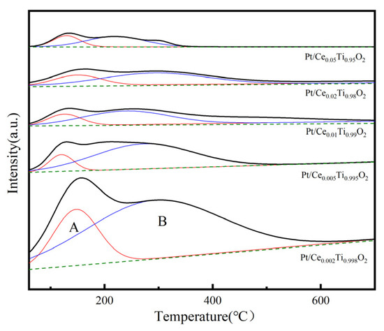 The surface acidity of the catalyst is related to the catalytic activity. The NH3-TPD results of the Pt/CexTi1−xO2 (x = 0.002, 0.005, 0.01, 0.02, and 0.05) catalysts are studied in this section and are shown in Figure 9. The obtained curves were fitted into several peaks, and all catalysts showed two desorption peaks. The desorption peaks between 100 and 200 °C and between 200 and 350 °C represent weak acid and medium acid [38], respectively, and are denoted as peaks A and B, respectively (see Figure 9). The data obtained after further quantification are shown in Table 3. It was found that the relative acid content of the catalysts significantly decreased with the increase in the doping amount. After calculation, the relative content of medium acid was sorted as follows: Pt/Ce0.01Ti0.99O2 (80.41%) > Pt/Ce0.005Ti0.995O2 (80.03%) > Pt/Ce0.02Ti0.98O2 (76.78%) > Pt/Ce0.002Ti0.998O2 (72.13%) > Pt/Ce0.05Ti0.95O2 (75.55%). Pt/Ce0.01Ti0.99O2 had the highest relative number of medium acid sites and exhibited the best activity. According to relevant literature reports, medium acids play a decisive role in VOC catalytic oxidation [39,40], and the broad peak centered at medium acid sites could also be assigned to NH3 weakly absorbed on Brønsted acid sites. The increase of Brønsted acid sites will improve the redox capacity of the catalyst, thereby improving the catalytic activity [41].