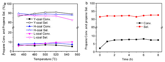 Furthermore, L-coal was used to study the long-time performance. Figure 1b manifests a good activity of L-coal at 480 °C for 8 h. The conversion of propane was 2.3% at initial time and then increased rapidly to ca. 7% with a stable propene selectivity of ca. 91%, which could be due to the activation process of coal powder at the initial period.