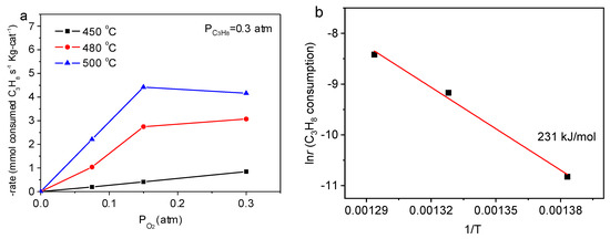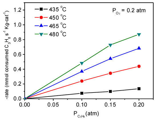 Figure 3 displays the rate of propane consumption as a function of PC3H8 at a given PO2. The rate of propane consumption increased linearly with its increasing partial pressure (0–0.2 atm), which is in agreement with the previous carbon-based report [37]. This indicates the first-order rate dependence with respect to propane.