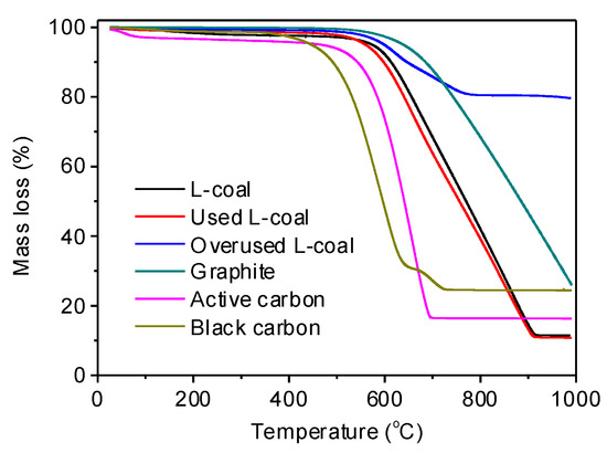 Thermo gravimetry (TG) analysis was often used to characterize the stability of the materials under ambient atmosphere. As shown in Figure 4, L-coal powder, used L-coal powder, and overused L-coal powder began to lose their mass at ca. 500 °C. The mass loss mainly comes from the high-temperature decomposition of the carbon part of coal. Active carbon and black carbon began their mass loss at lower temperatures (ca. 450 and ca. 400 °C, respectively), but graphite started at ca. 600 °C. Additionally, both L-coal powder and used L-coal powder manifested the biggest mass loss ca. 90%; that is to say, the carbon content in L-coal powder barely changed. Moreover, L-coal powder and used L-coal powder have high similarity in XRD patterns (Figure S6) and no obvious change in morphology by SEM observation (Figure S7), revealing that coal is relatively stable during the reaction at low oxygen partial pressures (7.5 kPa) and low temperatures (<500 °C).