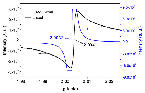 EPR spectra of L-coal powder and used L-coal powder.