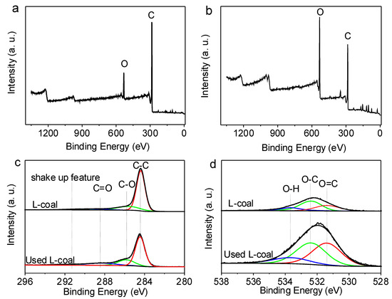 XPS spectra of (a) L-coal powder and (b) used L-coal powder, (c) C 1s core-level spectrum and (d) O 1s core-level spectrum of L-coal powder and used L-coal powder.