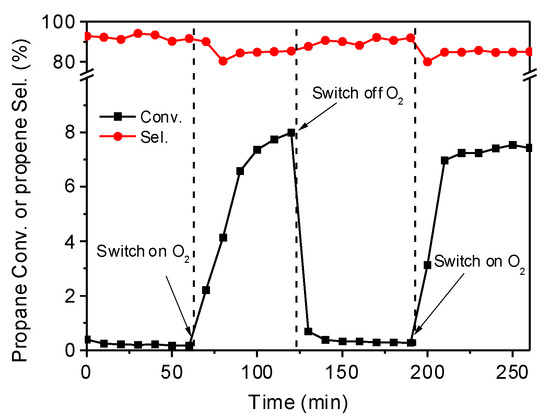 The effect of oxygen on catalytic activity over L-coal by switching on or off oxygen feeding. Reaction conditions: 30 kPa C3H8, with or without 15 kPa O2, N2 balance, mass space velocity 4000 mL·(h·g-cat)−1, 480 °C. 0.3 g catalyst, 20–40 mesh.